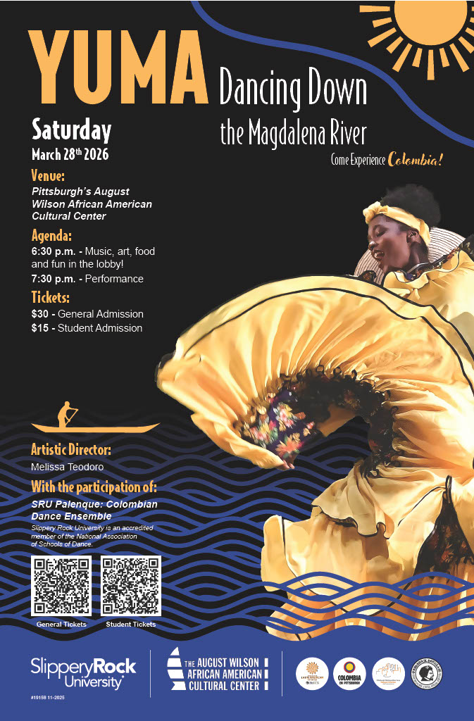 Slippery Rock University (SRU)-based dance company, Palenque, under the artistic direction of Melissa Teodoro presents Yuma, a concert that takes you on a journey down the Magdalena River. Yuma features music and dances born and practiced on the banks of Colombia’s main fluvial artery such as Bambucos, Fandangos and Bullerengues.